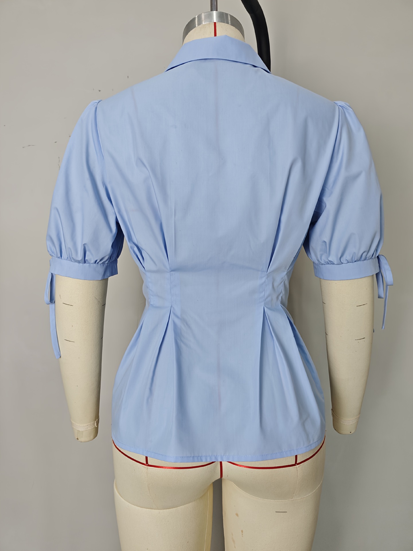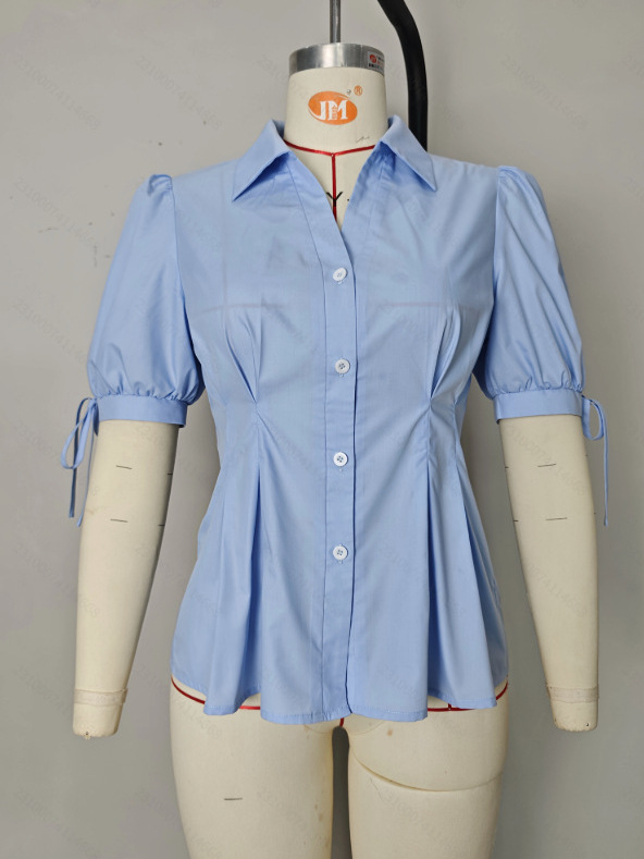 Office Spring Summer Waist Tight Waist a Swing Short Sleeve Cuff Lace up Design Pleated Slim Shirt Women Professional
