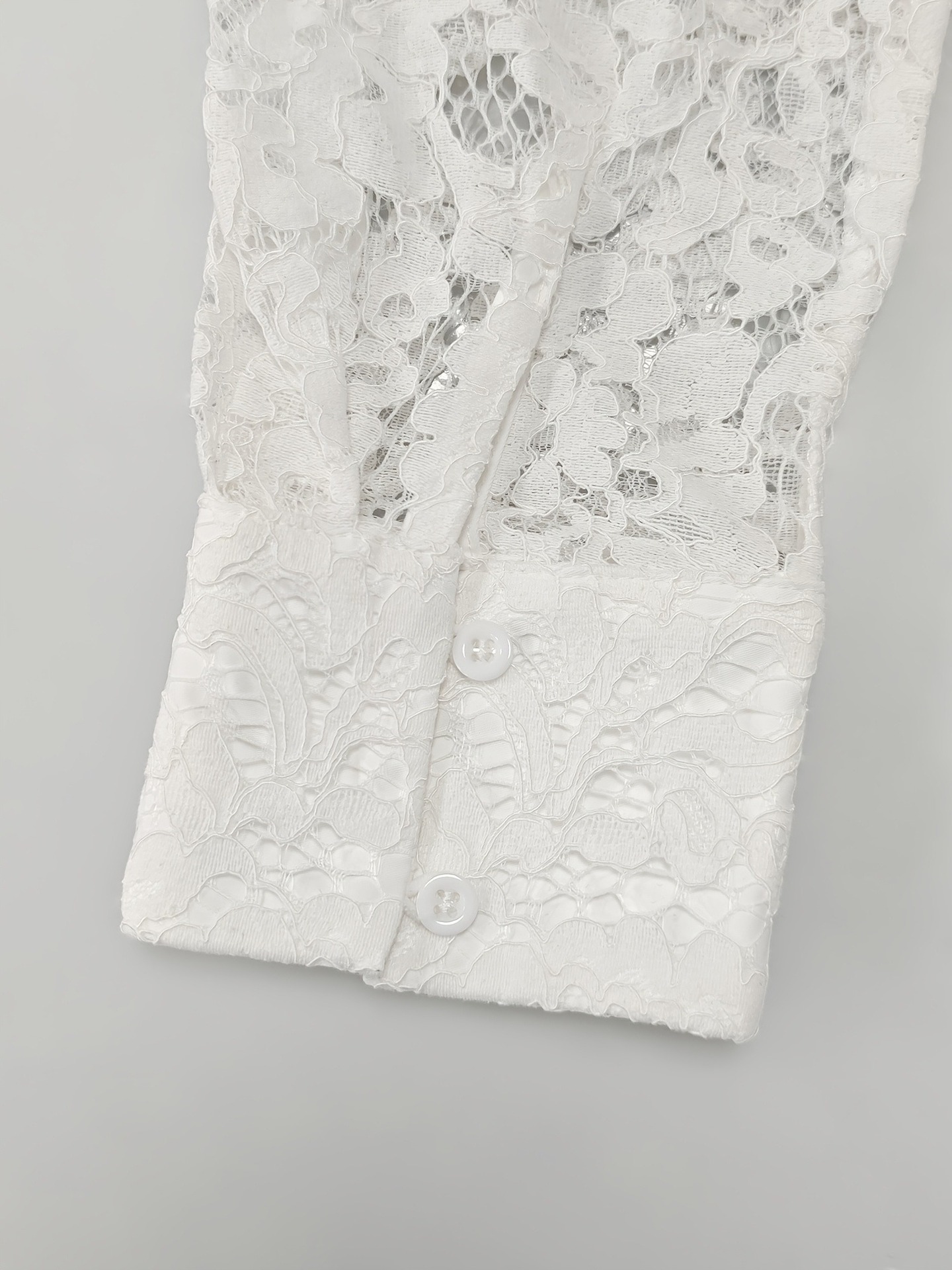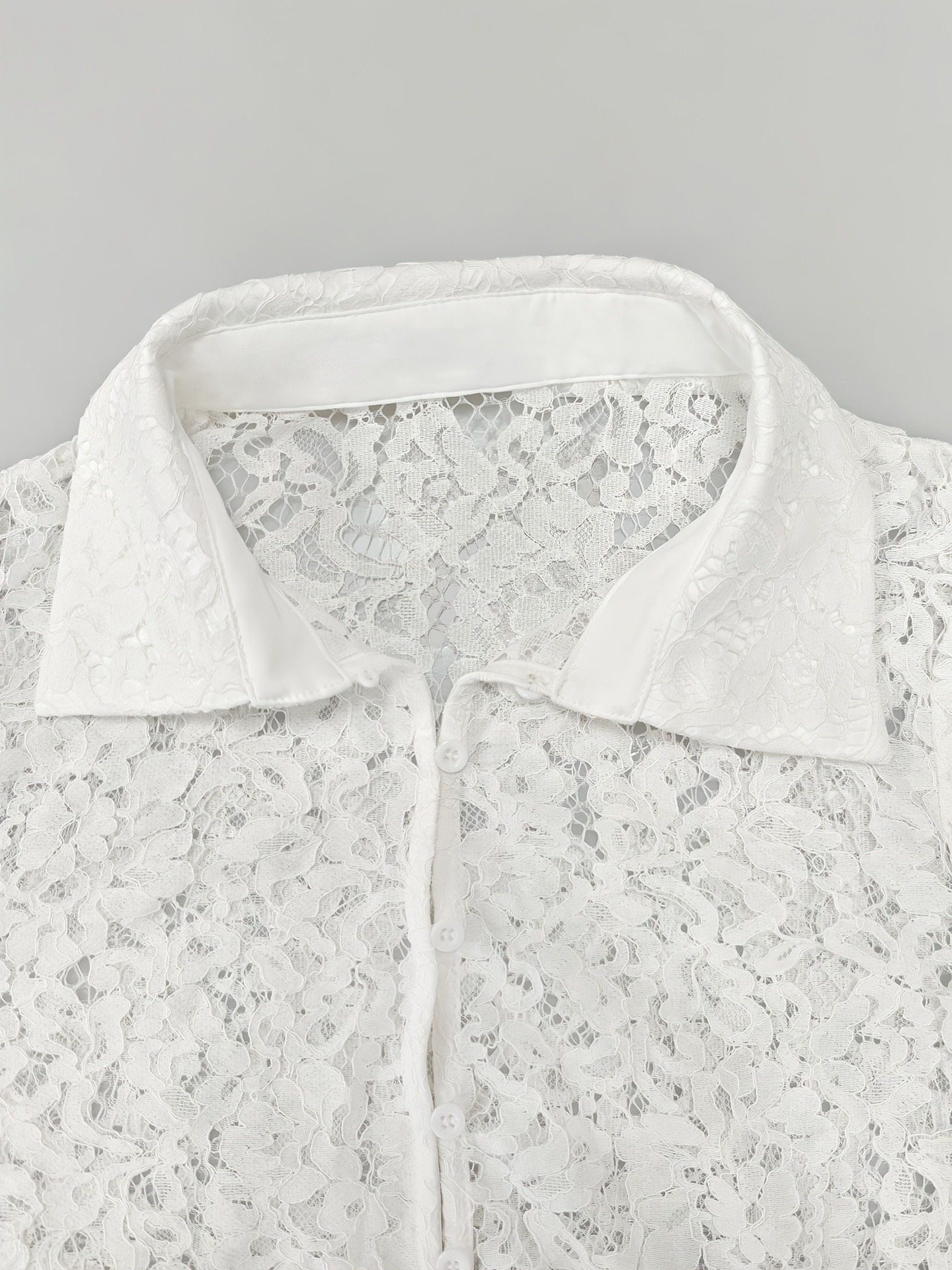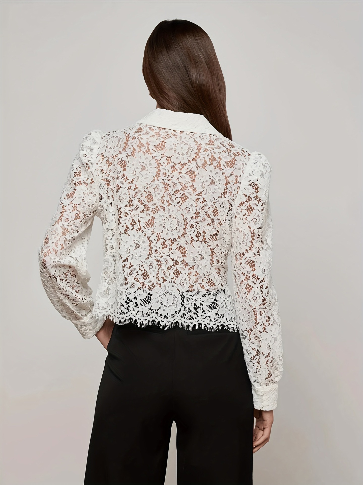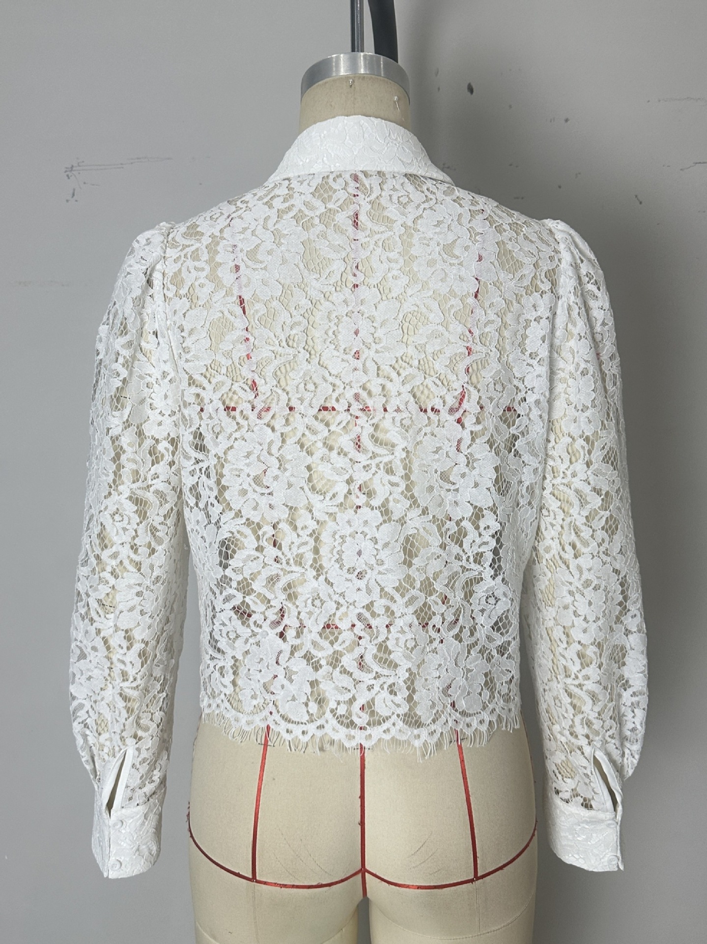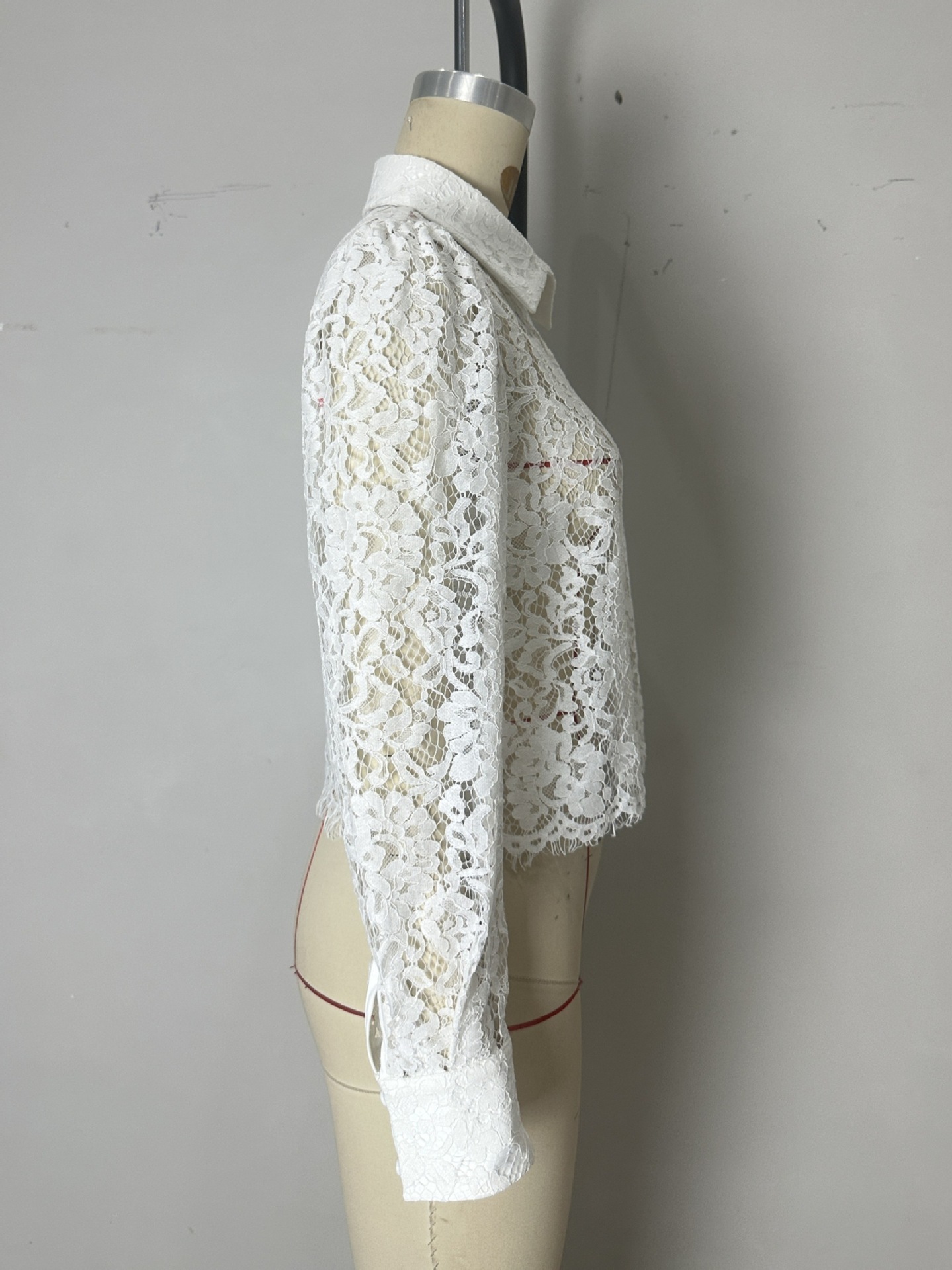 Women Clothing Sexy Lace Polo Collar Top Long Sleeve Tassel Edge Short Transparent Shirt